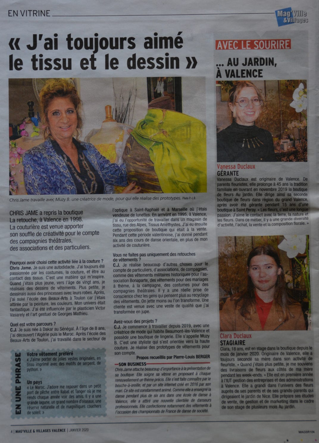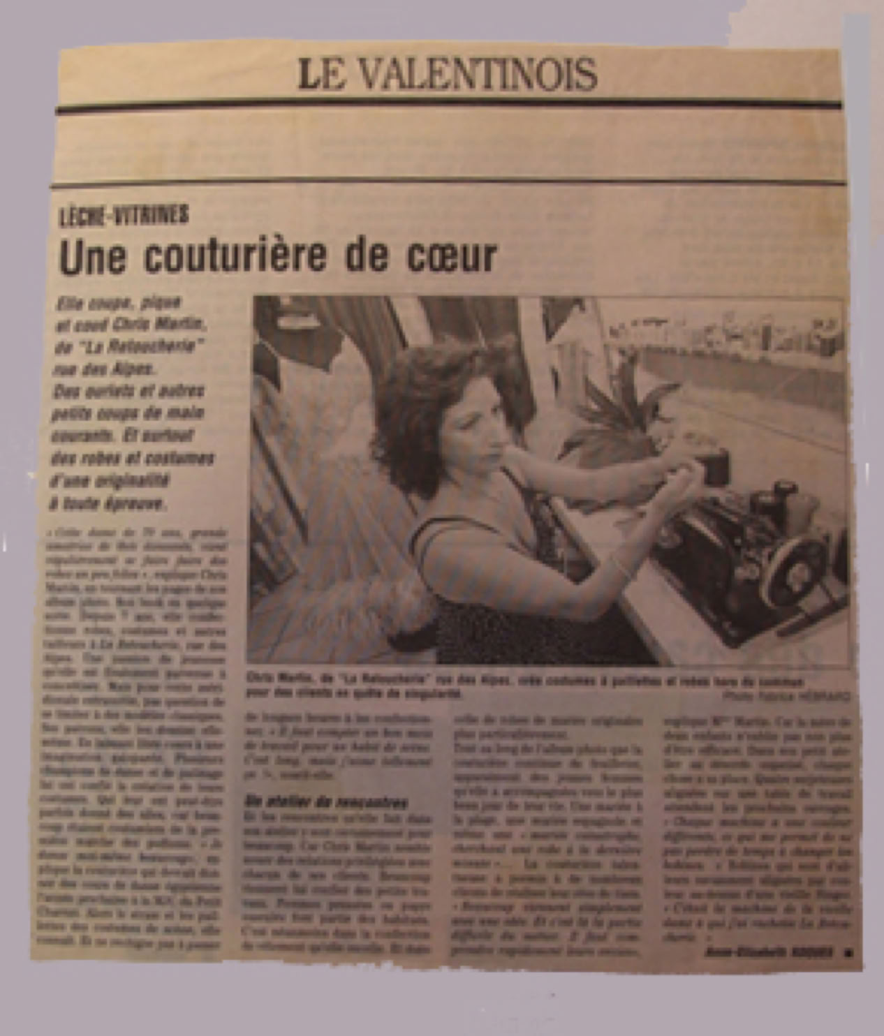 En 2018 : « Ici, vous pouvez faire votre capricieux(-se):Chrys saura répondre à votre attente, même si vous voulez un déguisement de Schtroumpf, une robe de princesse ou un costume de pirate. Elle vous confectionnera avec ses doigts de fée la robe de vos rêves, une veste inimitable. Cette couturière est également une spécialiste des costumes de danse et de fêtes de fin d’année. Chrys marie votre silhouette au tissu que vous lui amenez. Couture, confection, création, Chrys, féminine jusqu’au bout des ongles, est à votre écoute. »